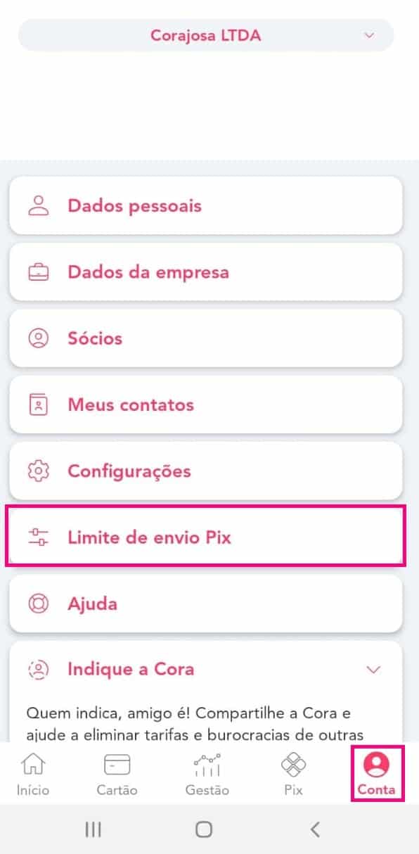 - Você deve acessar a área inicial do seu aplicativo Cora;
