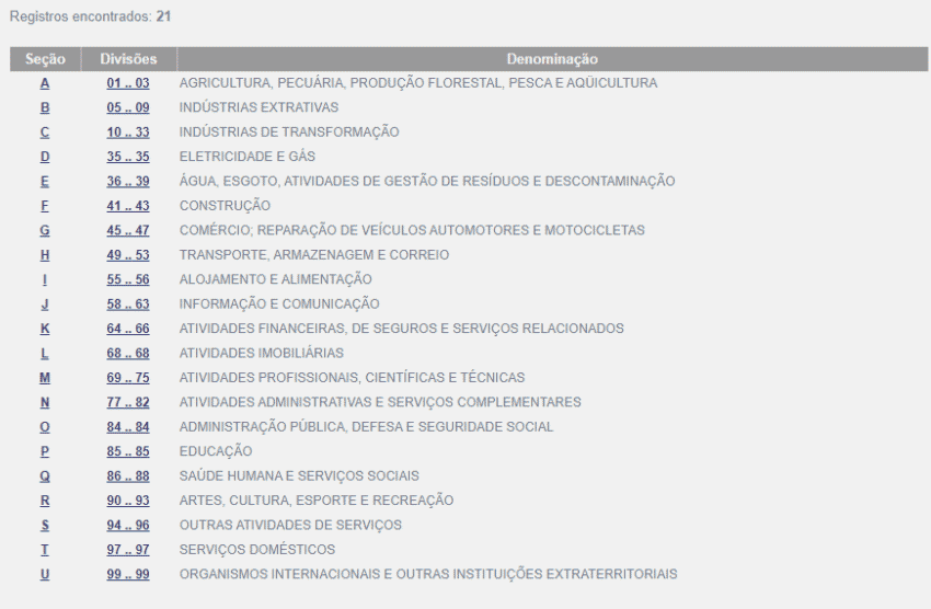 Essa classificação é formada por uma sequência de 7 números que representam a Seção, a Divisão, o Grupo, a Classe e a SubClasse da empresa.