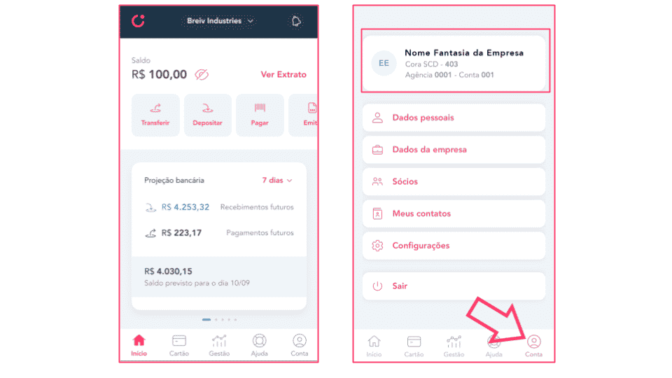Na tela inicial do aplicativo você já consegue visualizar um ícone novo, no menu inferior, chamado “Conta”. Ao clicar nele, você encontra todos os dados de cadastro da sua empresa, incluindo o número de agência e conta, que fica em destaque no início da tela. Olha só: