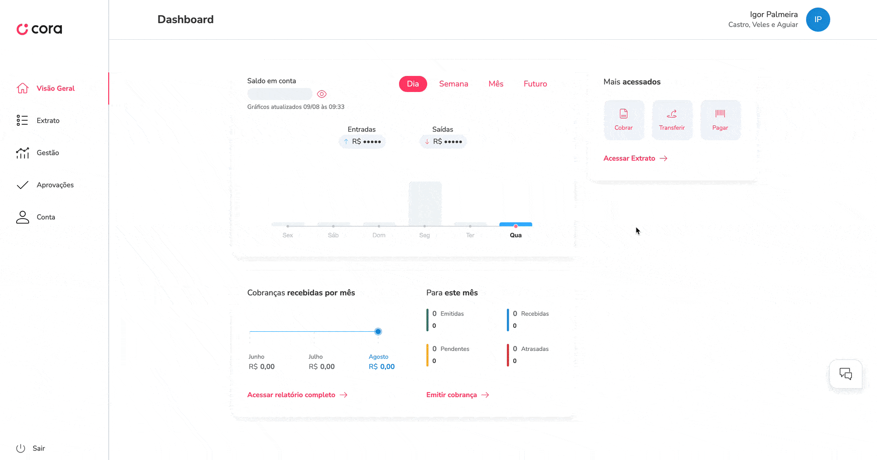 1. Acesse a sua conta pelo Cora Web e, no menu lateral, clique em Visão geral;