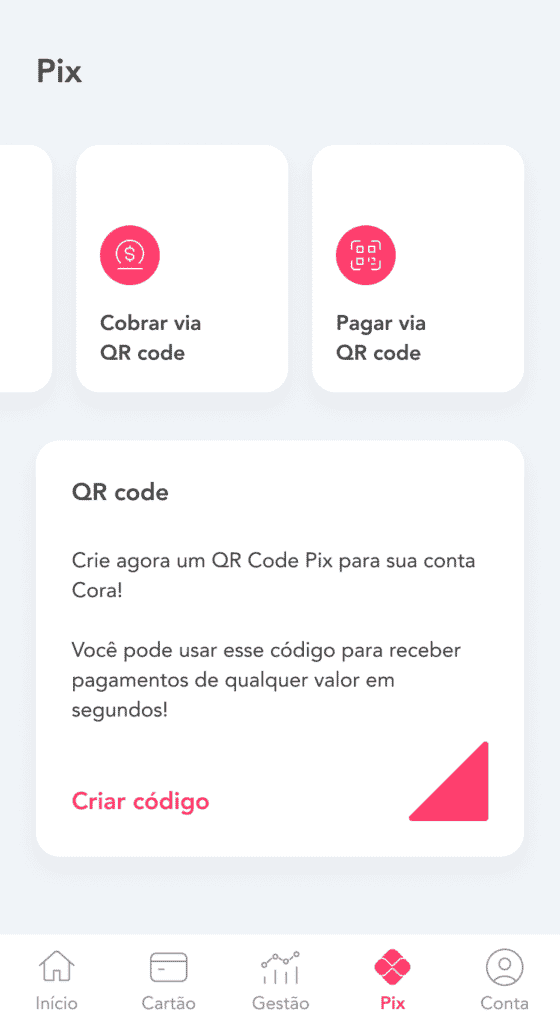 1- No aplicativo da Cora, selecione a opção Pix. Depois, clique no box ‘Criar QR Code’.
