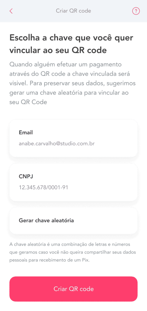 2- Escolha a chave que deseja vincular ao seu QR Code: e-mail, CNPJ ou uma chave aleatória.